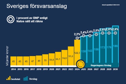Den svenska försvarsbudgeten ökar också och är även ett krav från Nato för att möta det växande hotet från Ryssland, och ha rätt typ av vapen om Ryssland går till anfall mot Nato och artikel 5 utlöses. Försvarsbudgeten ska växa från 148 miljarder i år till över 200 miljarder 2030. Vilket är snabbare än förra årets bild visar från försvarsbudgeten.
